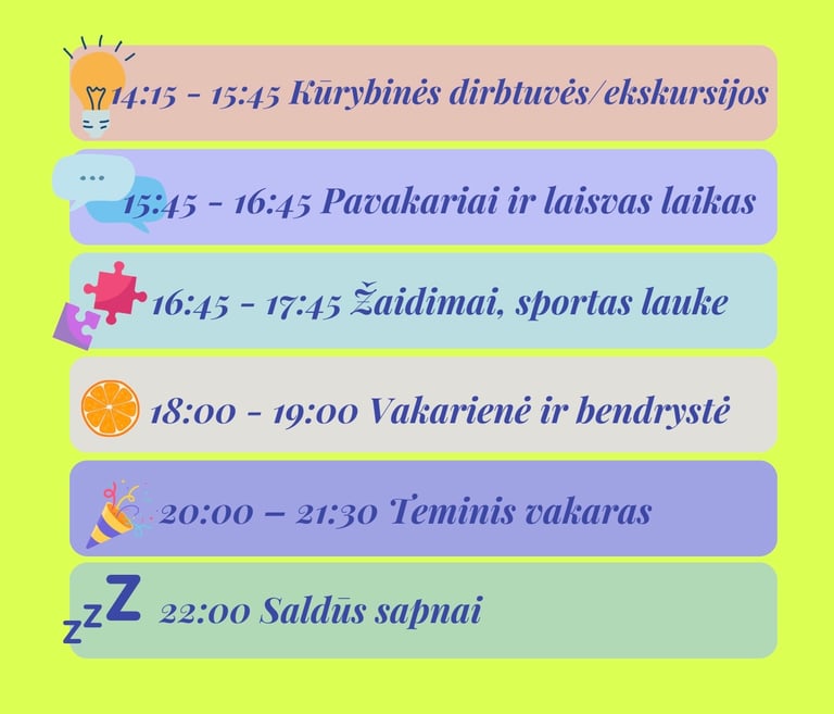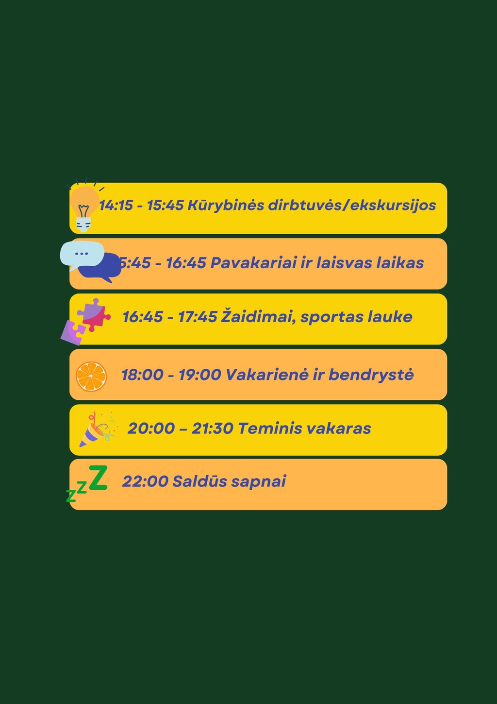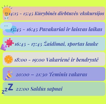 ★ Stovyklos veikloms skirtos kūrybinės, asmens higienos ir pirmosios pagalbos priemonės;