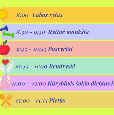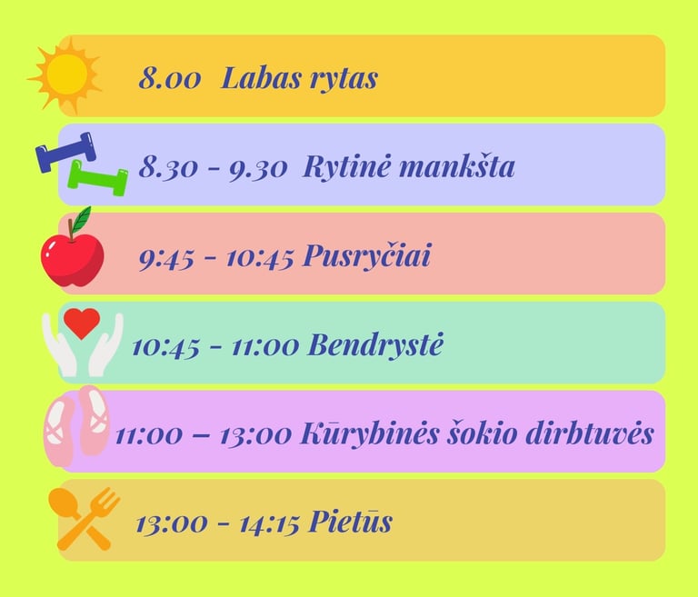 ★ Teminių vakarų pramogos (žaidimai, šokių kovos, šokių improvizacijos, filmų peržiūros ir refleksijos, sportinės estafetės...);